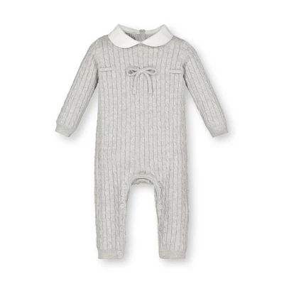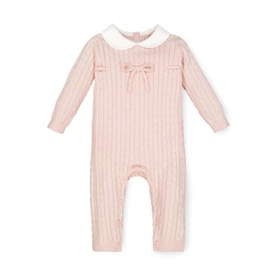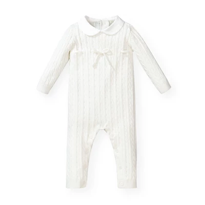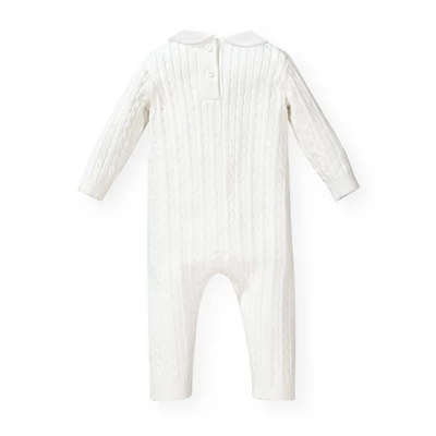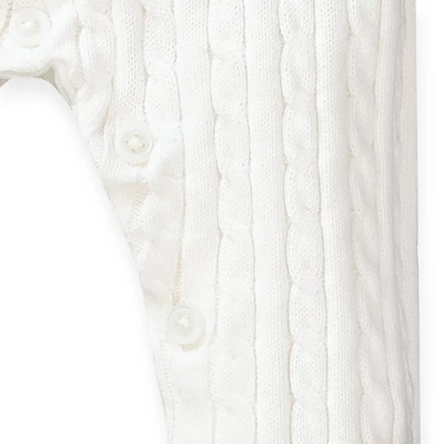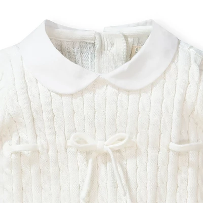 Our delicate cable sweater romper in soft organic cotton will be the heirloom piece for your baby that you hold on to forever. Features a woven peter pan collar, beautiful cable knit, and small knit tie at the upper waist. Button closure at the center back and inseam ensures ease of dressing baby.