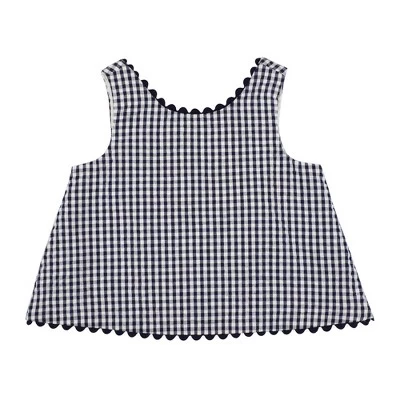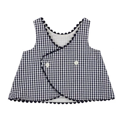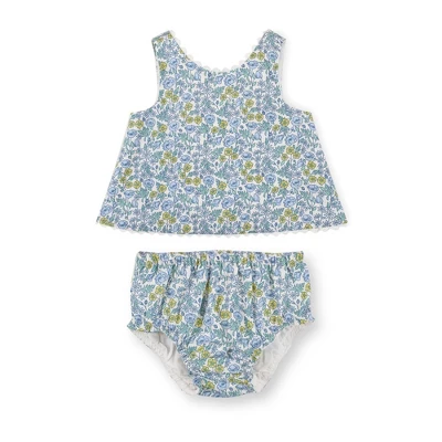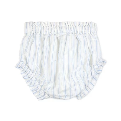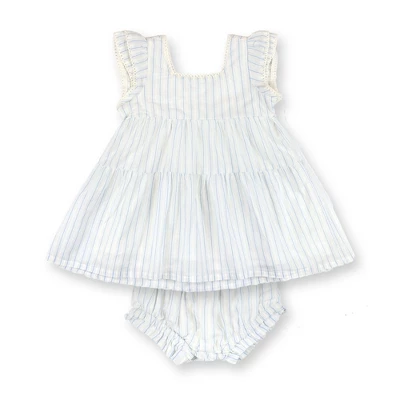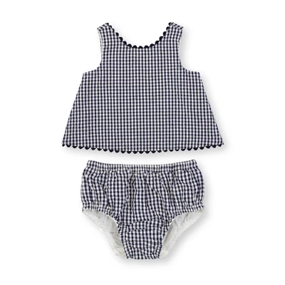 Dress your little darling in style in our adorable two-piece set cut from a soft organic cotton seersucker. Features a sleeveless flyaway back swing top with ricrac trim and a button opening at the center back. A matching ruffle bloomer with elastic leg openings completes the look for the ultimate outfit!