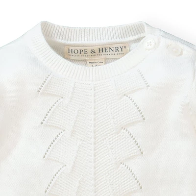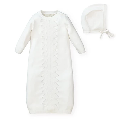 Little ones will love the feel of this soft organic cotton sweater gown with matching knit bonnet. The long sleeve gown features a beautiful pointelle stitch down the center and has a bottom opening that makes changes super easy for baby. Bonnet has a pre-tacked bow with hook and loop closure. A perfect shower gift or special occasion outfit!