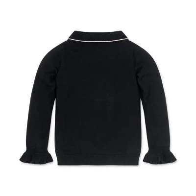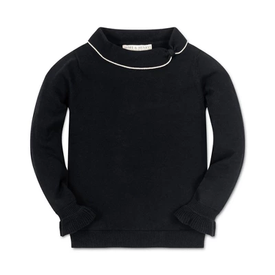 An everyday sweater with feminine flair that will have your girl looking polished in a snap! Our adorable pullover sweater in soft organic cotton is adorned with a sweet asymmetrical rounded collar with contrast tipping. Features ruffled cuffs for a fun and girly look. Pairs perfectly with our collection of organic cotton skirts and leggings!