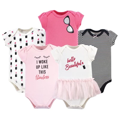 Little Treasure bodysuits are an essential part of baby’s wardrobe. Our bodysuits feature adorable prints, embroideries, stripes and solids and provide a comfortable base layer that’s great for pairing with pants, shorts, or even wearing under outfits. Our bodysuits are comfortable and cozy for all-day, everyday wear for your little one. Little Treasure Baby Girl Cotton Bodysuits 5pk, Lipstick is a great baby essentials set for your little one.