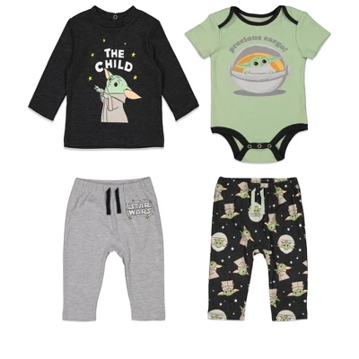 - Officially licensed Star Wars newborn and infant 4 piece mix n’ match clothing set: short sleeve bodysuit, graphic tee shirt, and pants