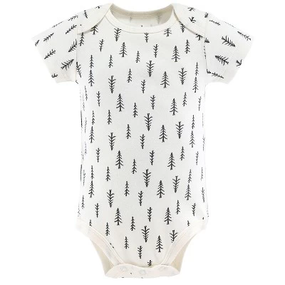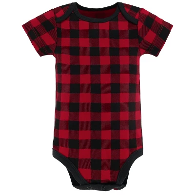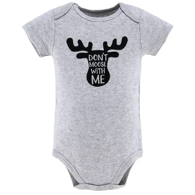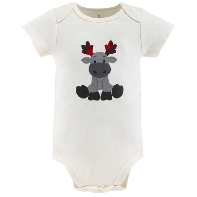 5 PIECE FUN & COLORFUL SHORT SLEEVE BODYSUIT SET: Your little one will be all snuggled up in this 5 Pc Short Sleeve Bodysuit set from The Peanutshell. Styles feature an allover print of forest trees, a classic buffalo plaid, and two solid styles with chest print details featuring a moose silhouette in matching buffalo plaid and a friendly moose face who is “Easily Amoosed”, all in shades of grey, black, red, and ivory. Made of super-comfy 100% cotton knit, each bodysuit is ideal for easy diaper changes and quick on & off with lap-shoulder and triple snap construction. Set of 5 will allow you to switch outfits as needed. Perfect for every day!