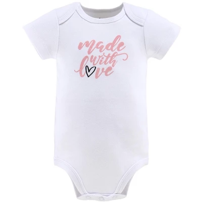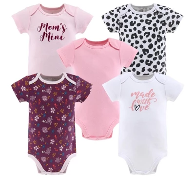 5 PIECE FUN & COLORFUL SHORT SLEEVE BODYSUIT SET: Your little one will be all snuggled up in this 5 Pc Short Sleeve Bodysuit set from The Peanutshell. Styles feature playful ditsy floral, animal print, and two printed slogans in shades of pink, black, white, and aubergine. Made of super-comfy 100% cotton knit, each bodysuit is ideal for easy diaper changes and quick on & off with lap-shoulder and triple snap construction. Set of 5 will allow you to switch outfits as needed. Perfect for every day!