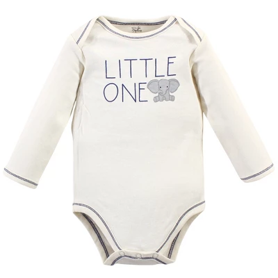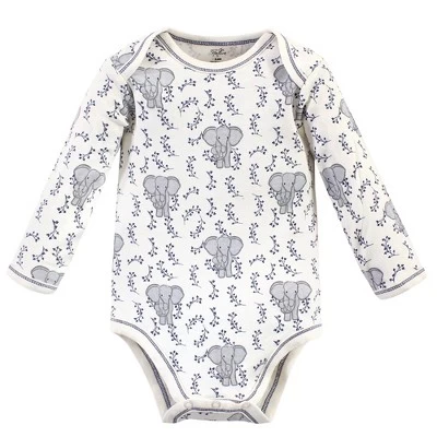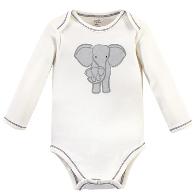 Touched by Nature offers soft organic cotton clothing for the gentlest touch on sensitive and delicate baby skin. Our organic bodysuits feature adorable prints, embroideries, stripes and solids and provide a comfortable base layer that’s great for pairing with pants, shorts, or even wearing under outfits. Our bodysuits are comfortable and cozy for all-day, everyday wear for your little one. Our bodysuits are an essential part of baby’s wardrobe. Touched by Nature Organic Cotton Long-Sleeve Bodysuits 5pk, Blue Elephant is a great baby essentials set for your little one.