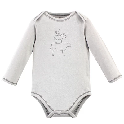 Touched by Nature offers soft organic cotton clothing for the gentlest touch on sensitive and delicate baby skin. Our organic bodysuits feature adorable prints, embroideries, stripes and solids and provide a comfortable base layer that’s great for pairing with pants, shorts, or even wearing under outfits. Our bodysuits are comfortable and cozy for all-day, everyday wear for your little one. Our bodysuits are an essential part of baby’s wardrobe. Touched by Nature Organic Cotton Long-Sleeve Bodysuits 5pk, Farm Friends is a great baby essentials set for your little one.